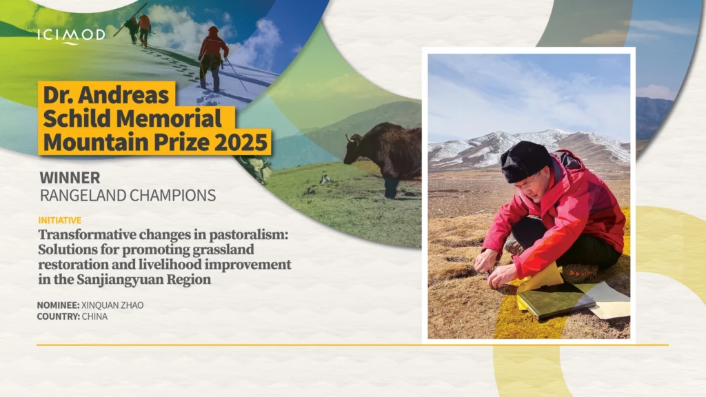 在 2025 年国际山岳日当天,ICIMOD 授予青海大学赵新全教授领衔的团队 “牧场恢复先锋奖”。该奖项旨在表彰获奖团队在草原恢复、可持续放牧、社区参与及传统知识保护领域的卓越贡献,其工作成果实现了生态修复与牧民生计改善的协同发展。